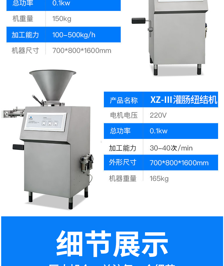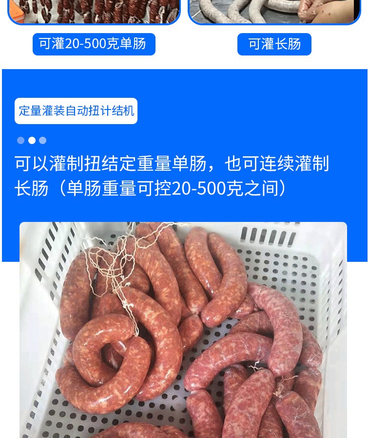 名稱自動紐結(jié)灌腸機(jī) 電源220V 功率0.5kw 產(chǎn)量100-500kg/h 尺寸 重量 規(guī)格 其他