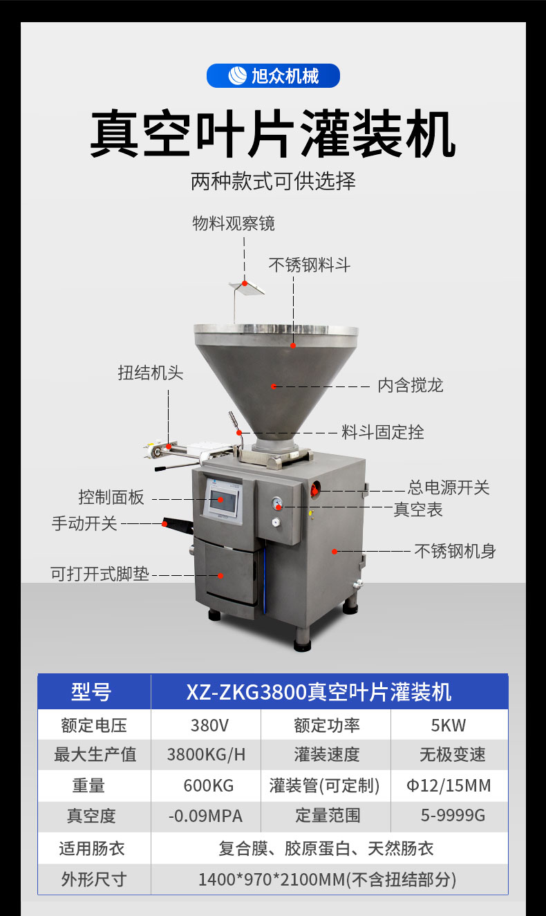 名稱XZ-ZKG3800真空葉片灌裝機(jī) 電源380v 功率5kw 產(chǎn)量最大值3800kg/h 尺寸1400*970*2100mm(不含扭結(jié)部分) 重量600kg 規(guī)格5-10000g 其他